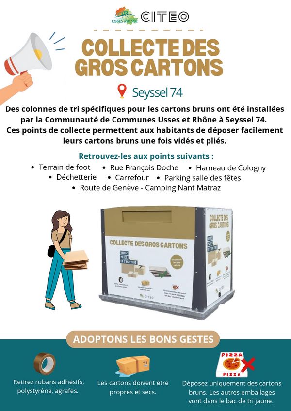 En partenariat avec Citeo, la Communauté de Communes Usses et Rhône installe des colonnes de tri spécifiques pour vos cartons bruns, près des points de tri sélectif. Plus besoin de vous déplacer en déchetterie pour vos gros cartons !