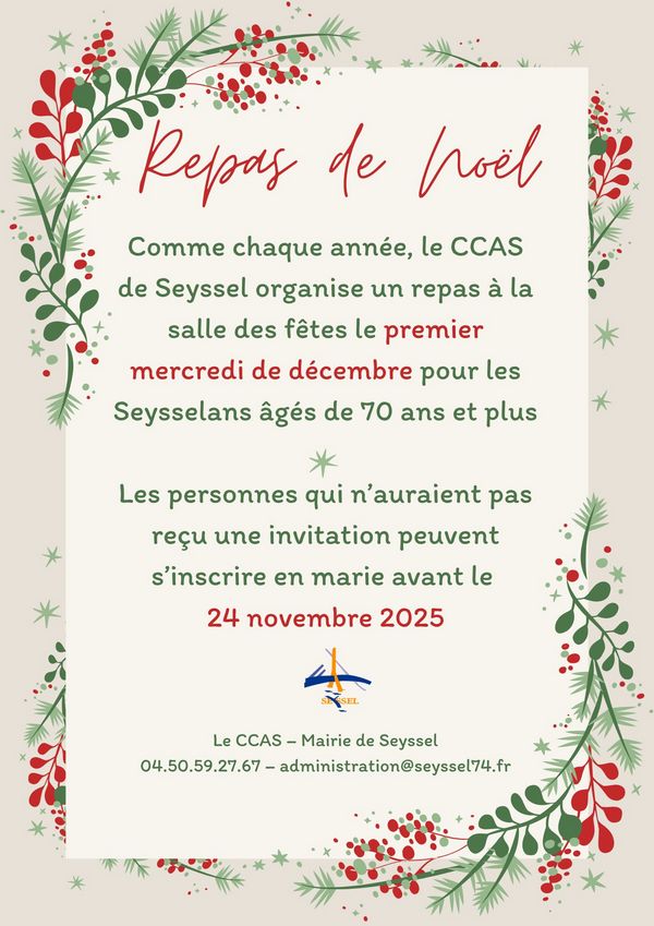 Le traditionnel repas des aînés des deux Seyssel approche ! Pour les seysselans âgés de 70 ans ou plus, qui n’auraient pas encore reçu d’invitation, veuillez contacter la mairie avant le 24 novembre 2025.