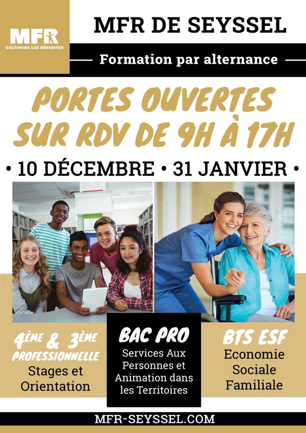 La MFR de Seyssel vous ouvre ses portes mercredi 10 décembre, de 9h à 17h, pour une journée entièrement dédiée à la découverte de nos formations et à la rencontre de l’équipe éducative.