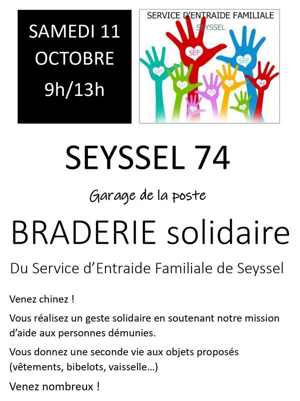 Braderie du SEF samedi 11 octobre 2025 dès 9h au garage de La Poste de Seyssel 74